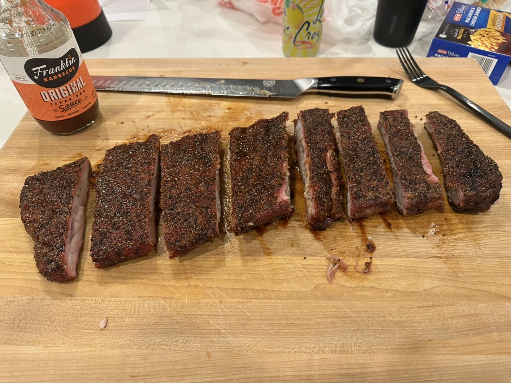 Some summertime ribs. Used a premade rub and then lathered on some Matty Matheson BBQ sauce. I'm no smoke pro, but the wiggle room you get makes it a great way to cook.